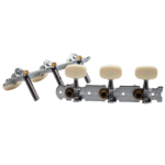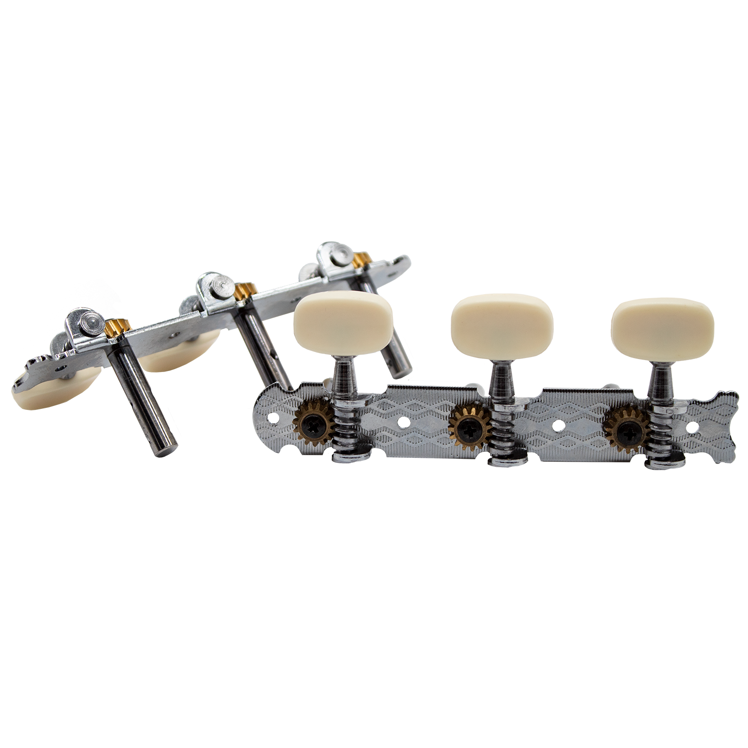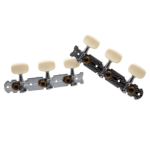 Dos sets de 3 clavijas en línea con engranaje abierto. Ideal para reparación o reemplazo en guitarras clásicas de tamaño estándar. Presentan un acabado cromado duradero y de alta calidad y perillas ergonómicas de plástico blanco que facilitan la afinación.