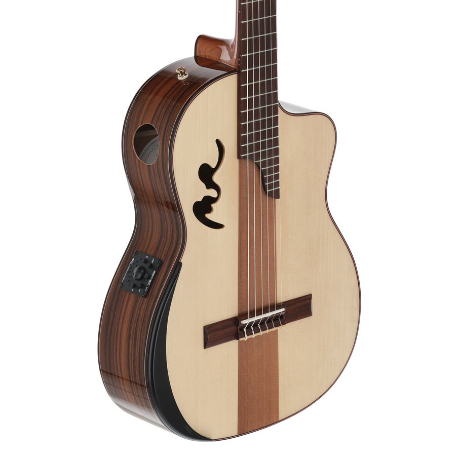 Guitarra Clásica Electroacústica con resaque, serie Café Cortado. Tapa de Abeto sólido con una línea central de Cedro sólido, fondo y costado de Palo de Rosa Santos.